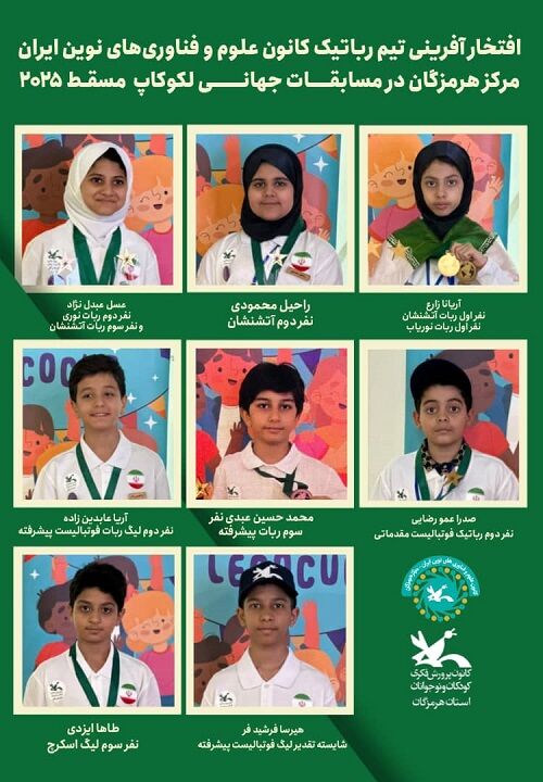 به گزارش صبح دریانیوز به نقل از روابط عمومی اداره کل کانون پرورش فکری کودکان و نوجوانان هرمزگان، در این دوره از مسابقات آریانا زارع موفق به کسب رتبه اول جهانی ربات نور یاب و ربات آتش نشان شد. همچنین عسل عبدل نژاد در رشته ربات نوری رتبه دوم و در رشته ربات آتش نشان بر جایگاه سوم ایستاد.