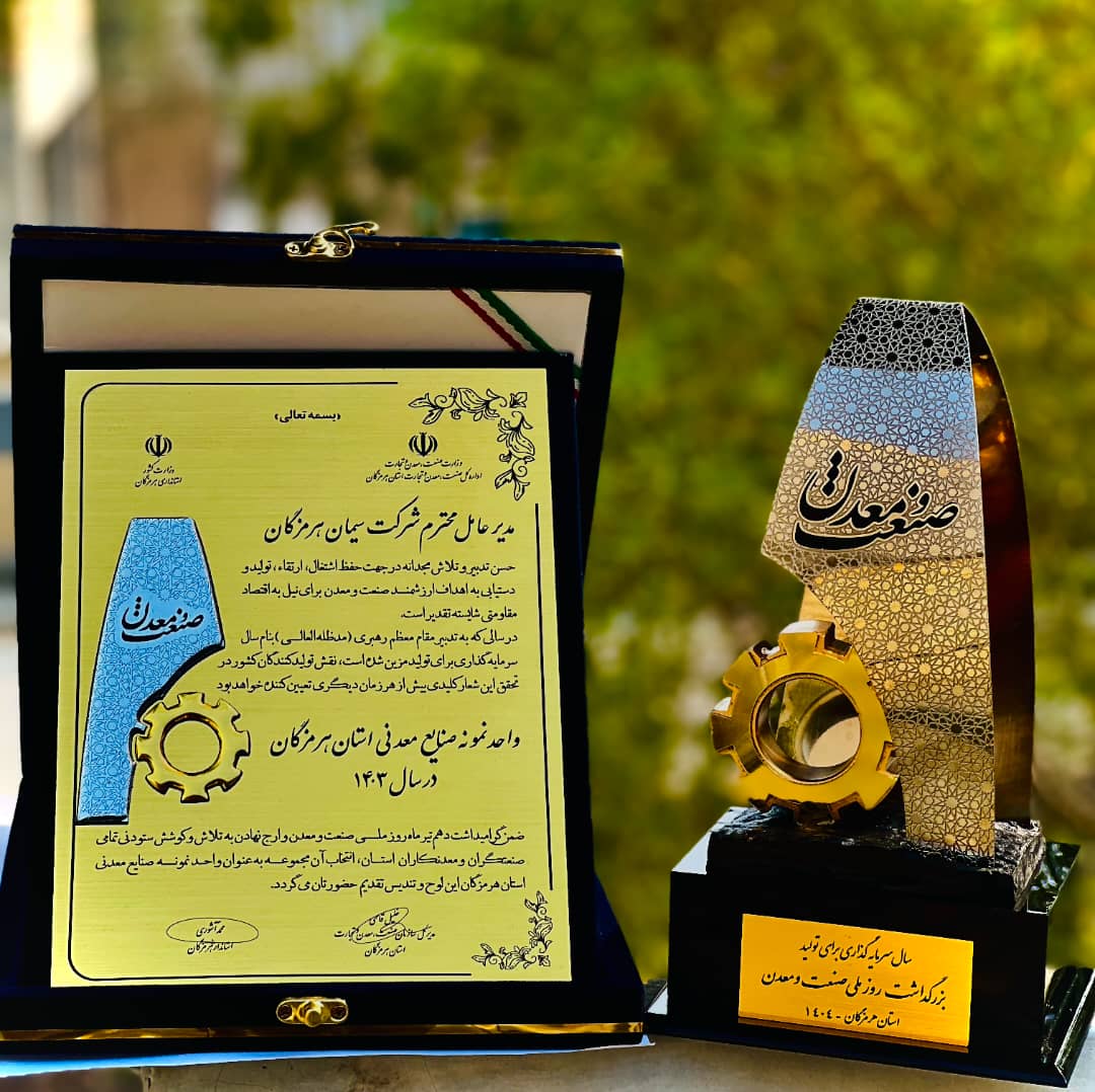 ضمن گرامیداشت دهم تیرماه روز ملی صنعت و معدن و ارج نهادن به تلاش و کوشش ستودنی تمامی صنعتگران و معدنکاران استان انتخاب آن مجموعه به عنوان واحد نمونه صنایع معدنی استان هرمزگان این لوح و تندیس تقدیم حضورتان می گردد.